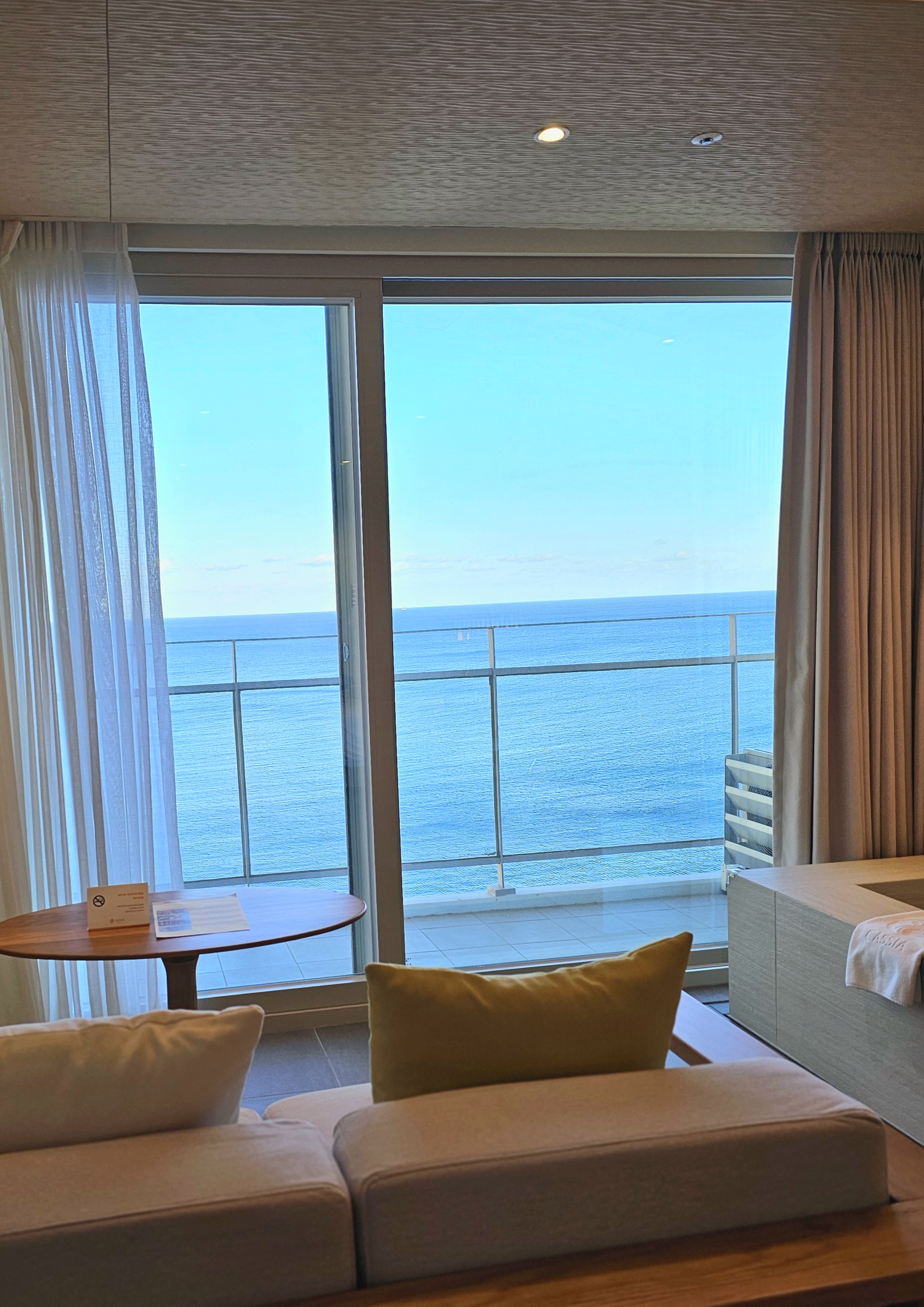 - 객실 창밖으로 보이는 오션뷰는 감탄을 자아냈습니다. 들어가자마자 "우와!" 소리가 절로 나왔을 정도로 멋진 바다 풍경이 한눈에 들어왔습니다.