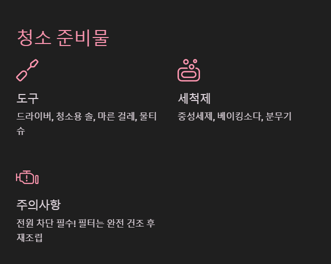 ⚠️ 너무 강한 세척제는 부품을 손상시킬 수 있어요.