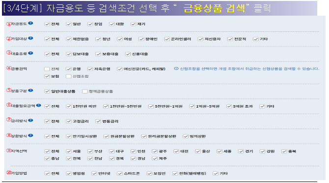 - 자금 용도, 가입 대상, 대출 종류, 상품구분 등 총 10종의 검색 조건 제공.