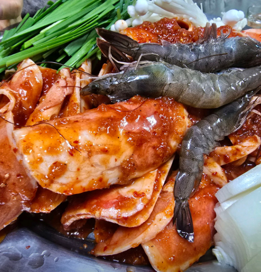 고추장 베이스 양념에 오리불고기, 거기에 부추, 새우, 양파, 팽이버섯이 어우러져