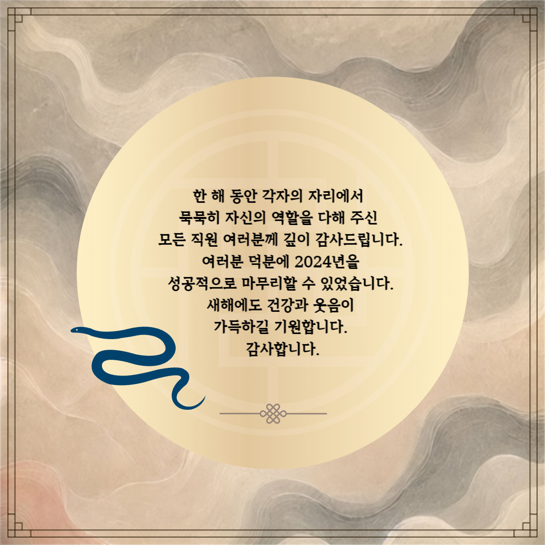 "2024년 한 해 동안 아낌없는 지원과 응원을 보내주신 모든 분들께 감사의 인사를 전합니다. 다가오는 2025년에도 더 큰 성과와 행복을 나누는 한 해가 되기를 소망합니다. 새해 복 많이 받으세요!"