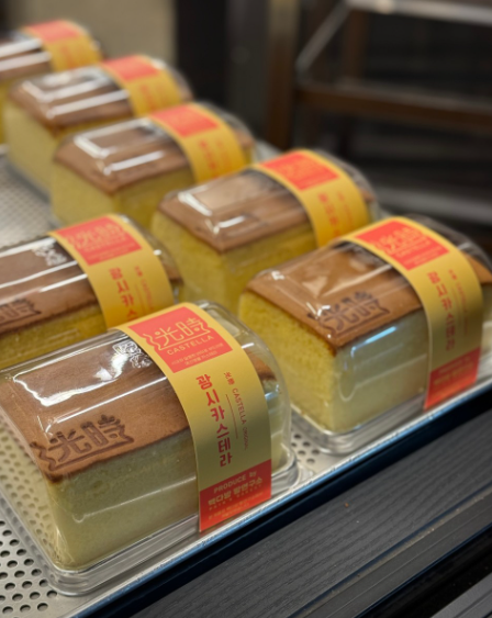 겉은 폭신하고 속은 촉촉한 이 카스테라는 고소한 버터 풍미가 살아 있는 게 특징이에요.
