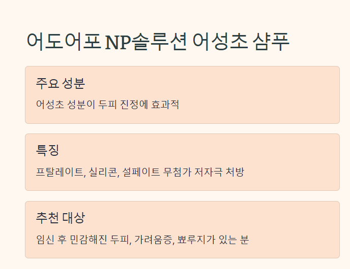 이 샴푸는 어성초가 주성분이라 두피가 예민한 분들에게 특히 좋아요.