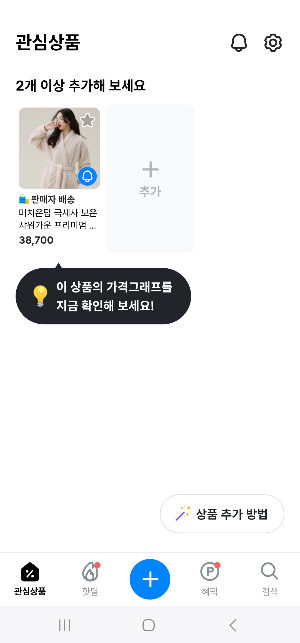 - 앱에서 관심 키워드(예: "커피머신", "무선청소기")를 입력합니다.