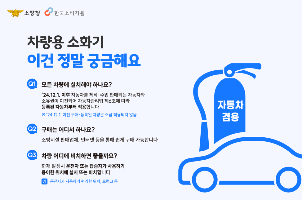2024년 12월 1일부터 5인승 이상의 모든 차량에 차량용 소화기 설치가 의무화되었습니다.